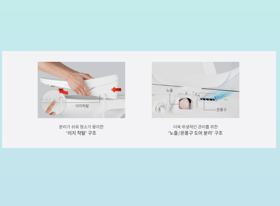 온수 온도를 일정하게 유지하는 연속 온수 시스템으로 예민한 부위가 온도차로 자극받지 않게 해 주며 물 나오는 노즐 부분이 세균 오염 방지로 항균 처리가 되어있고 보송보송하게 마무리 건조기능까지 추가가 되었어요 좋은 기분이 들어 괜스레 계속 앉아있고 싶은 게 단점이라면 단점이겠어요