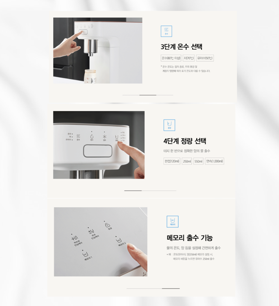 거기다 자주 쓰는 용량이랑 온도를 메모리로 설정해서 버튼 하나로 간편하게 출수도 가능하고요