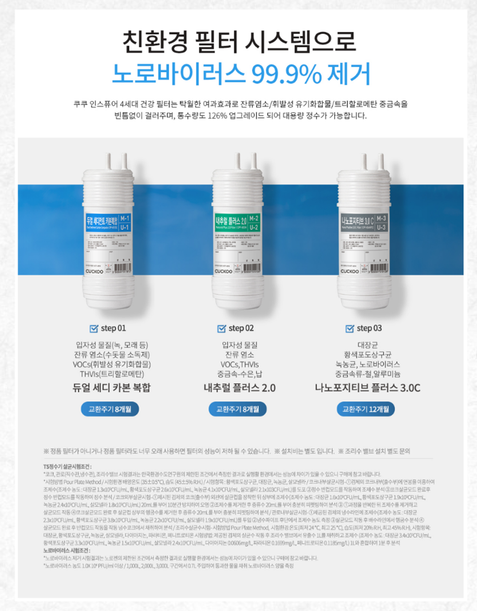 대장균, 황색포도상구균, 녹농균, 노로바이러스, 중금속류- 철, 알루미늄 등을 걸러 주어