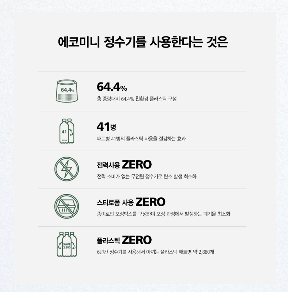 에코 미니 정수기 사용 하나로 많은 부분에서 환경을 지킬 수 있게 되는데요