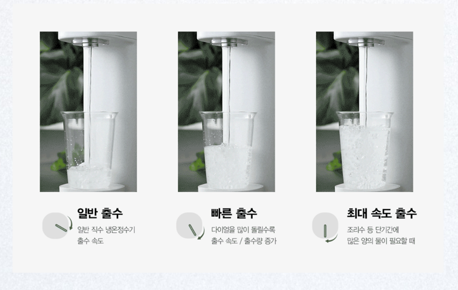 물이 담겨 있다 나오는 게 아닌 직수 방식으로 다이얼을 돌리면 바로 물이 나오면서