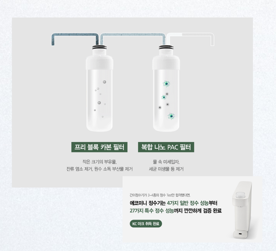 일반적인 간이 정수기가 3~4종의 정수 Test만 합격했다면, 에코미니 정수기는 4가지 일반 정수 성능부터
