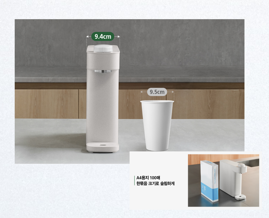가로로 9.4cm의 종이컵보다 슬림한 사이즈로 복잡하고 좁은 주방 어디에나 설치가 가능하여